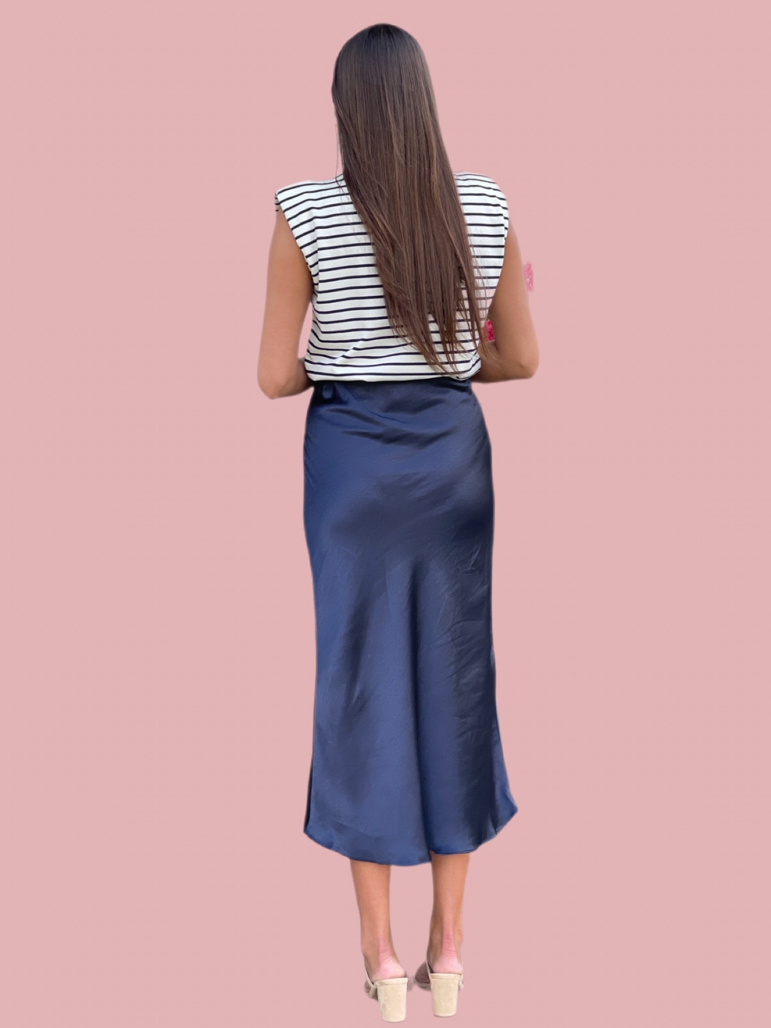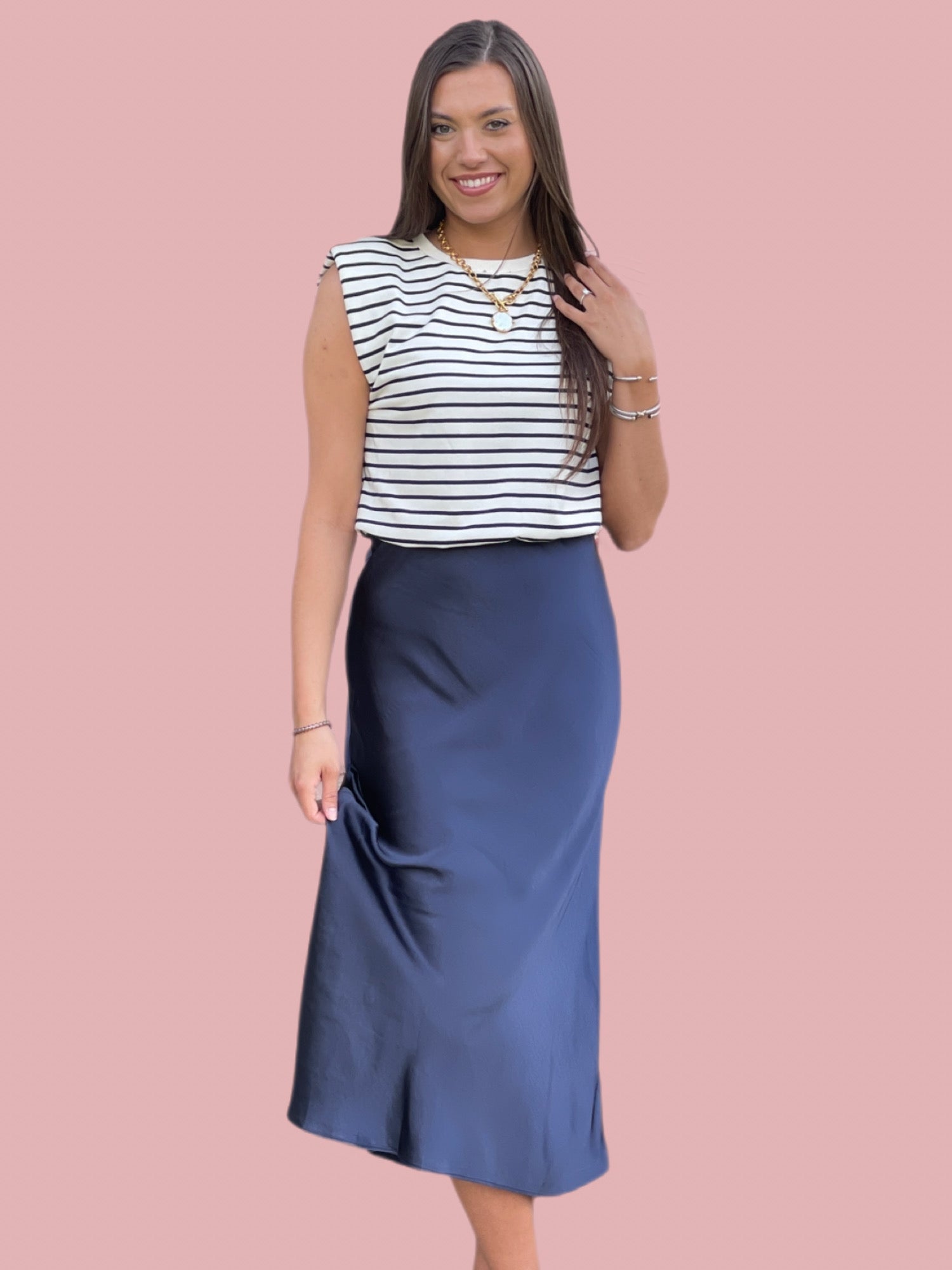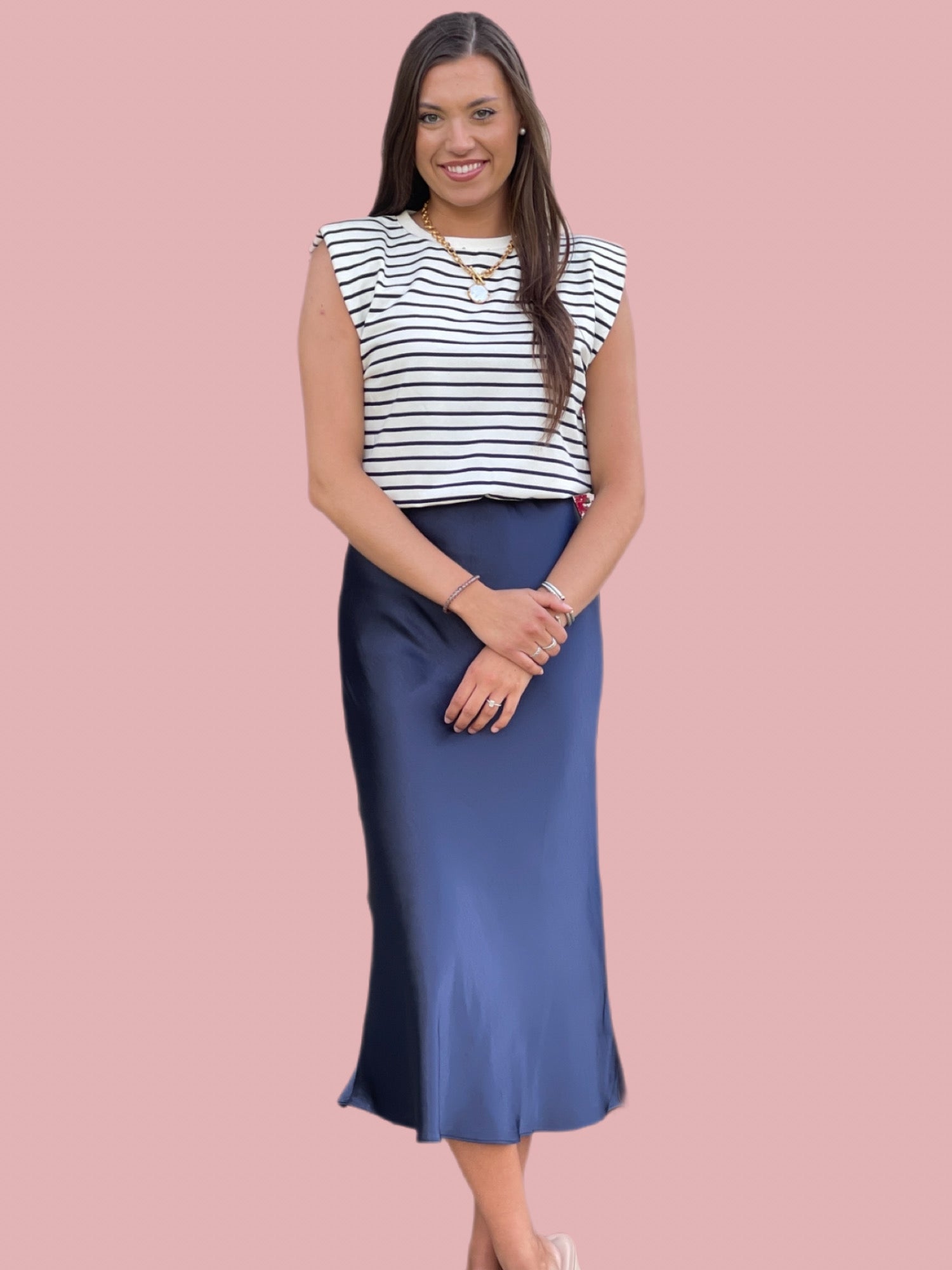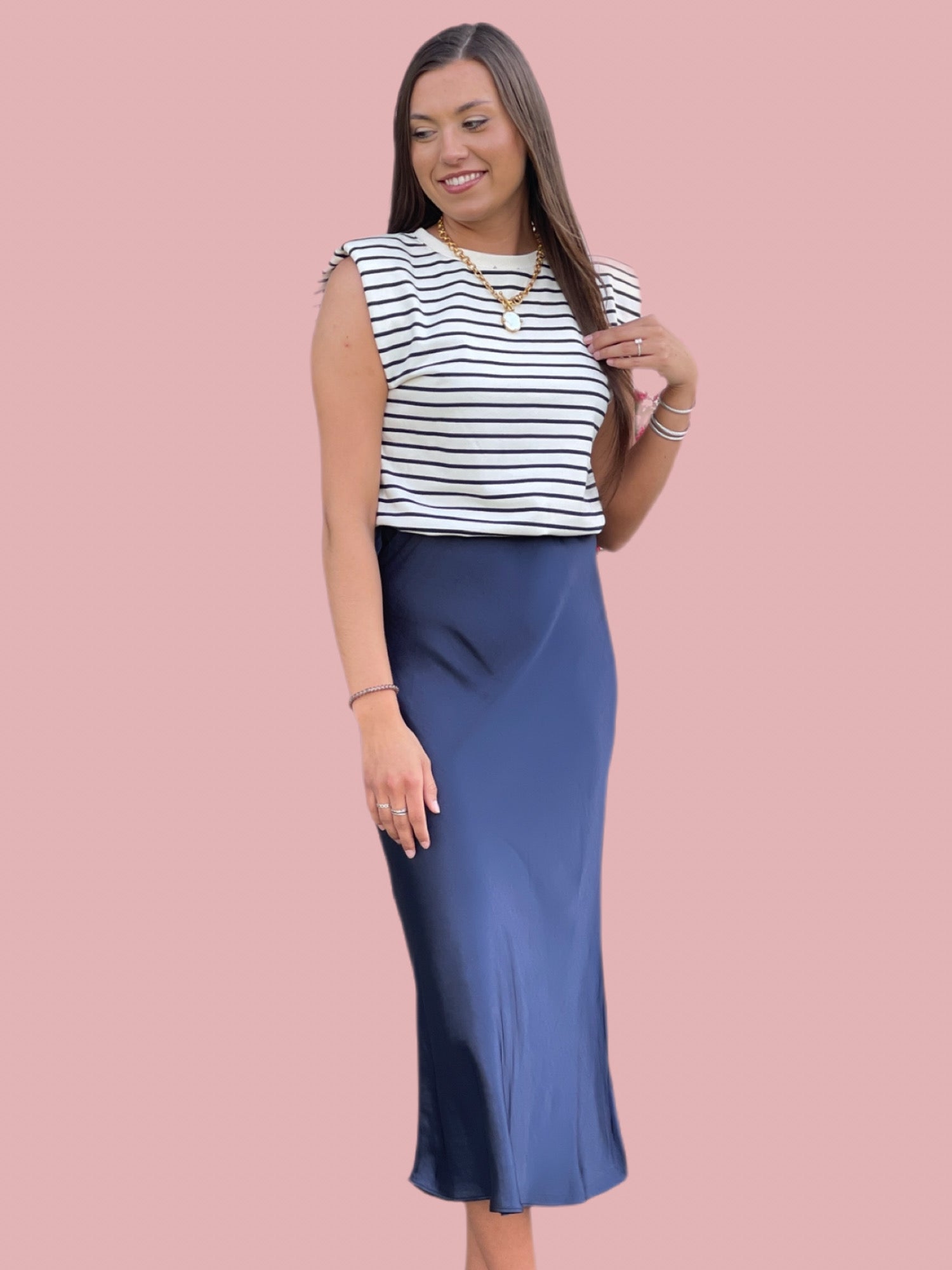 This Striped Satin Sleeveless Maxi Dress boasts a sophisticated and chic design with its striped pattern and attached satin skirt. The rounded neckline and cap sleeves with shoulder pads add structure and style to this dress, while the elastic waist and relaxed silhouette make it comfortable and flattering. Elevate your look with this must-have dress.