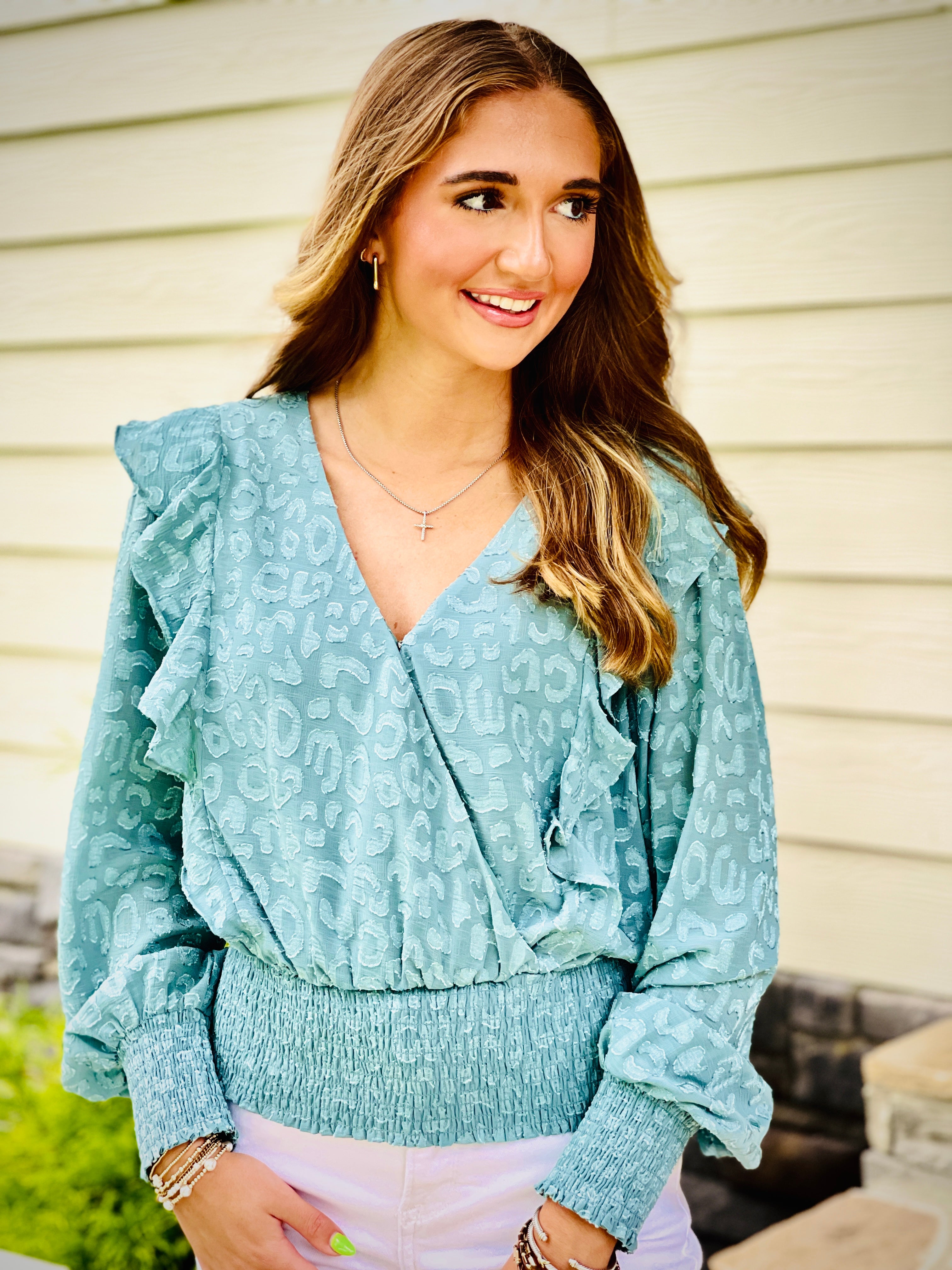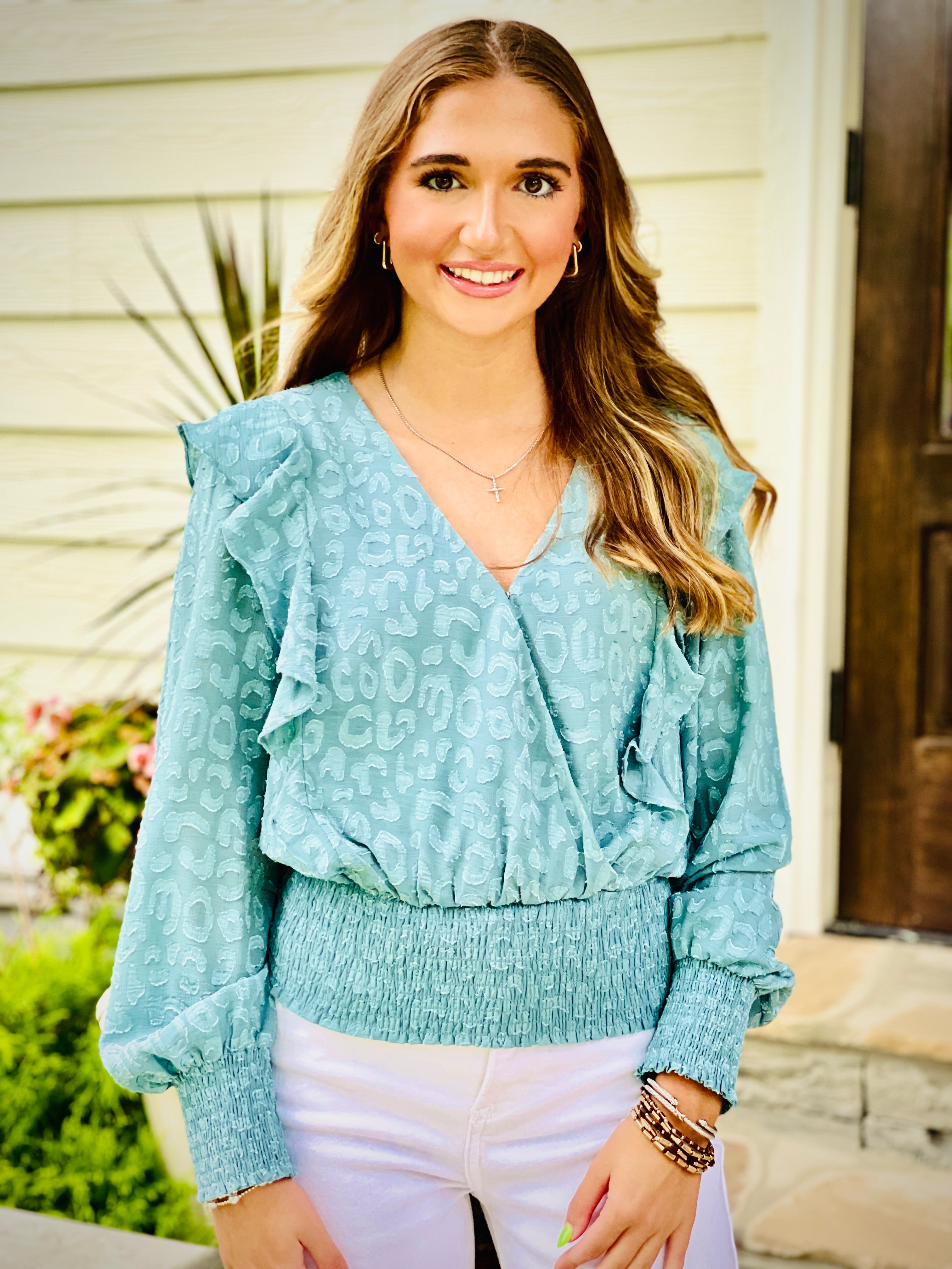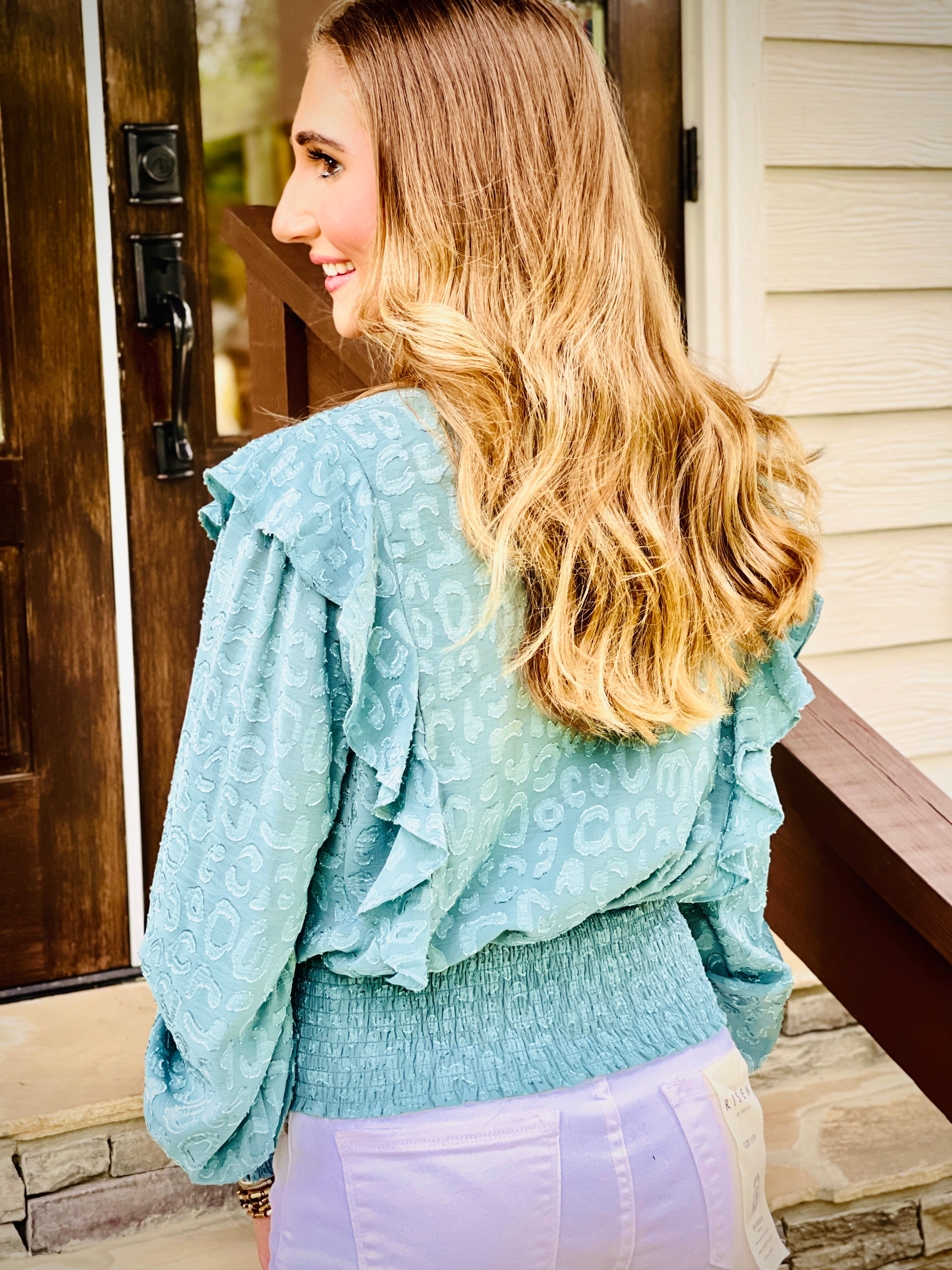 This long-sleeved top features a soft burn out jacquard material and a smocked bottom for a comfortable fit. The shoulder ruffle detail adds a touch of femininity. Perfect for adding some texture and style to any outfit.