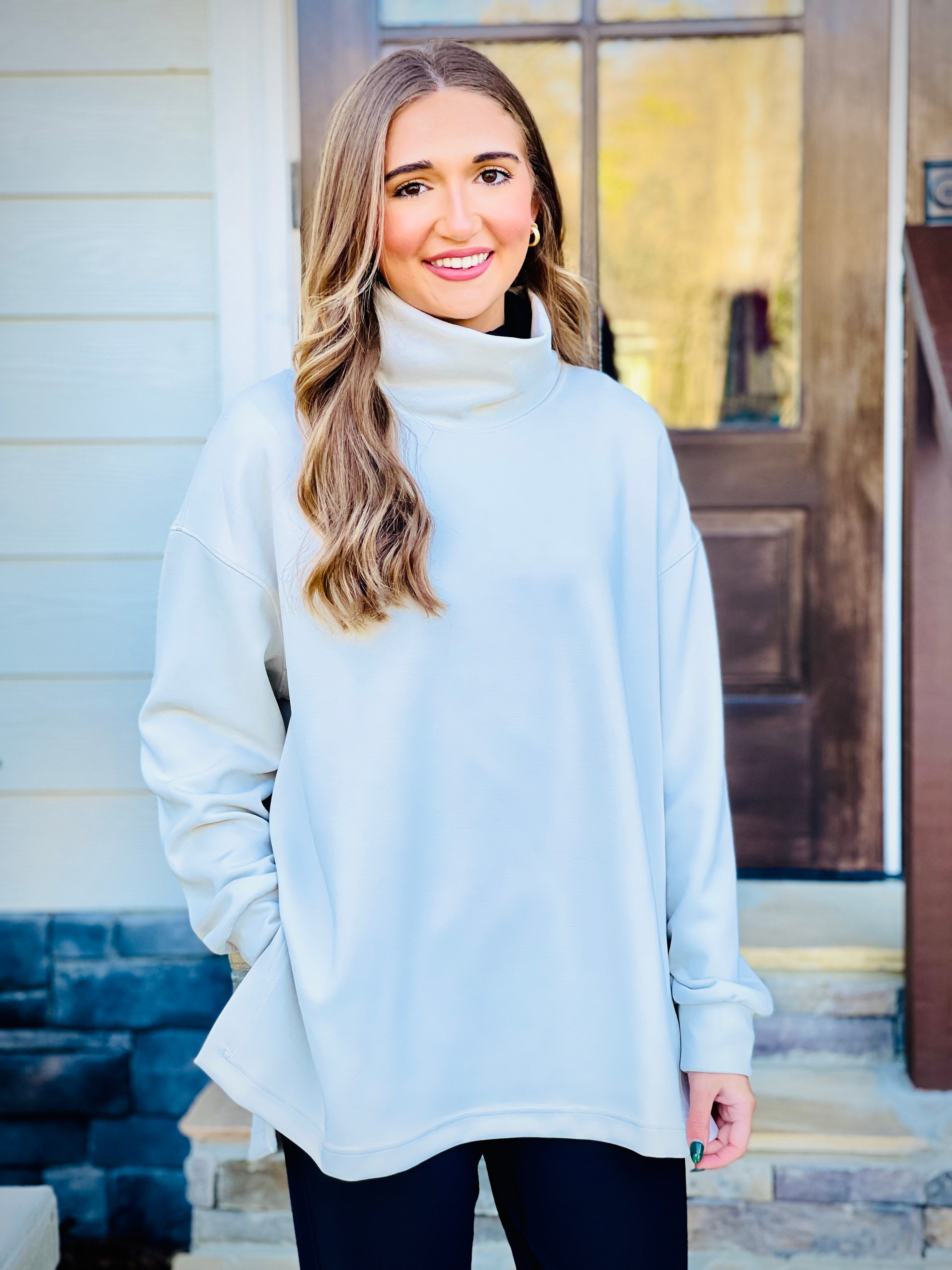 Shoulder season, hacked. With a peach-fuzz soft outside and cool feel next to skin, this funnel-neck pullover is perfect for those days when the weather can't make up its mind.