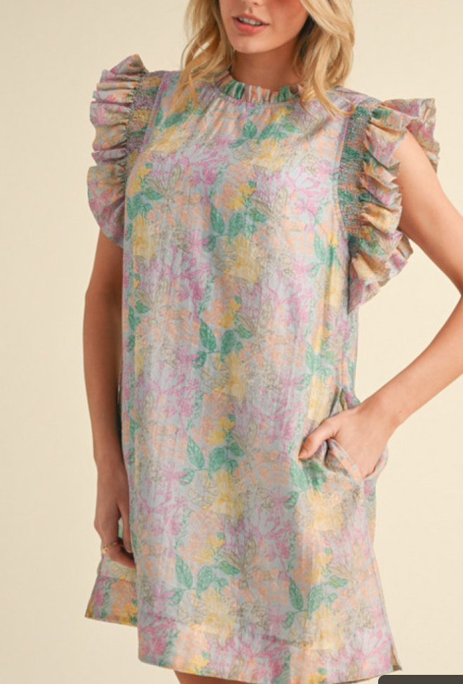 Effortlessly chic, this floral print dress features a frill mock neckline and smocked ruffle cap sleeves. Made with lightweight, non-sheer material, it offers both comfort and style. Perfect for any occasion, this dress is a must-have for any fashion-forward wardrobe.