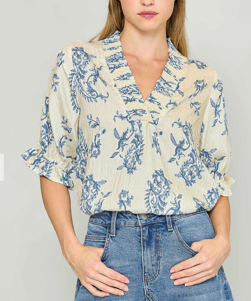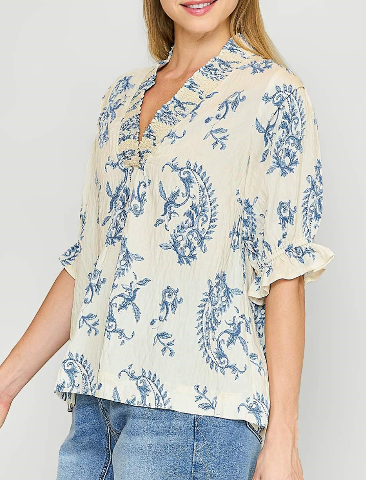 Discover the perfect blend of style and comfort with The Boheme Bloom Top. Featuring a beautiful paisley print, this V-neck top is accented with smocking details for a touch of elegance. The 3/4 sleeves add a classic touch, while the lightweight design makes it perfect for any occasion.