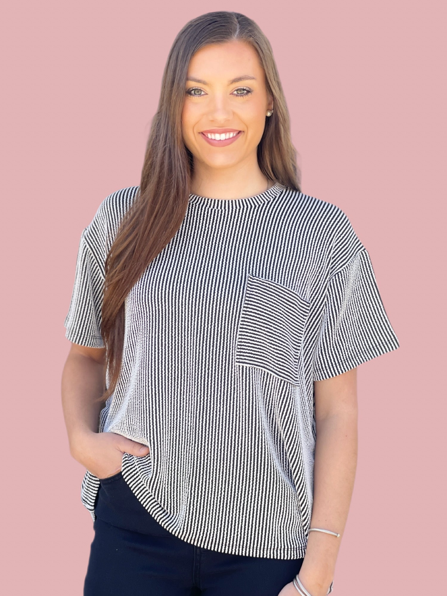 Expertly designed with a wavy corded rib knit, this Relaxed Fit Short Sleeve Top features a front pocket for added convenience. Stay comfortable and stylish with this top's easy, breezy fit. Perfect for any occasion.