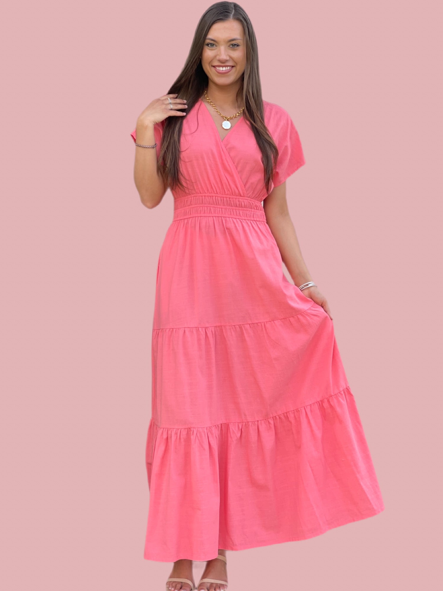 Elevate your wardrobe with our Dolman Sleeve Tiered Maxi Dress with Pockets. This stylish dress features dolman sleeves and a tiered design, creating a flattering silhouette. With the added bonus of pockets, it's the perfect combination of fashion and function. Perfect for any occasion, this dress is a must-have for any fashion-forward individual.