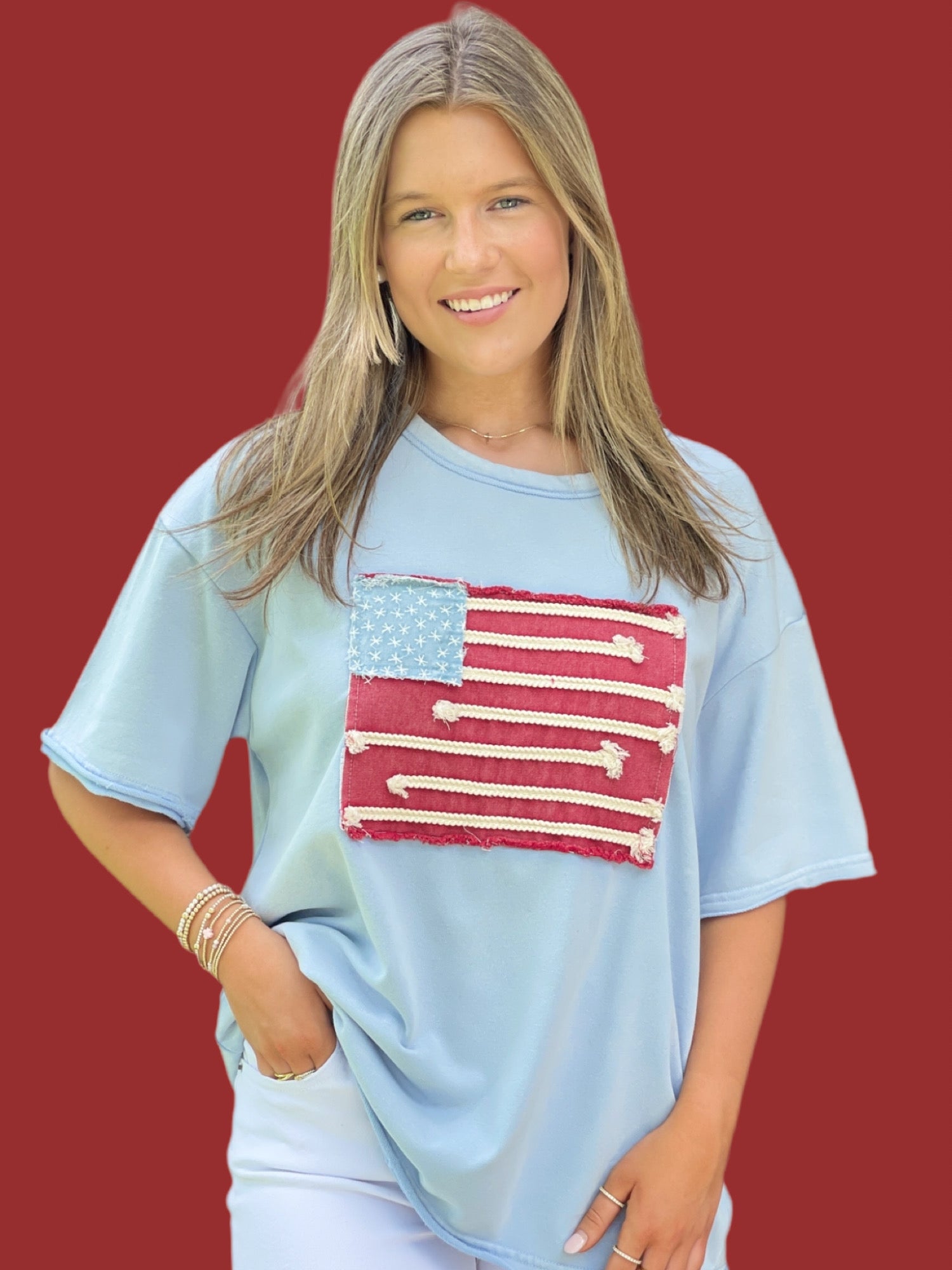 This washing cotton top is designed for comfort and style, featuring a U-neck and drop shoulder for a relaxed fit. The natural hems and front American flag detail add a touch of patriotic flair. The lightweight and non-sheer fabric make it perfect for everyday wear.