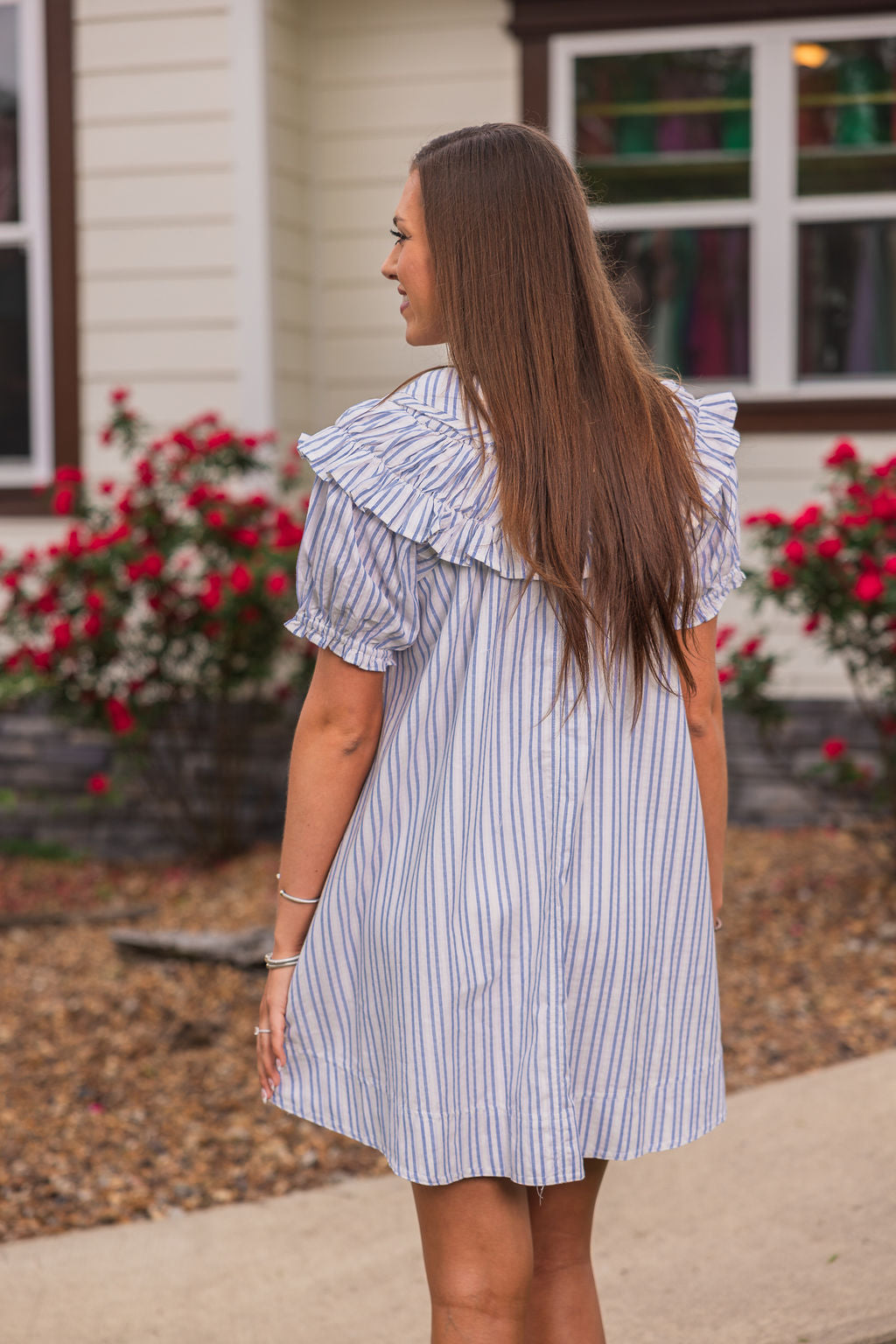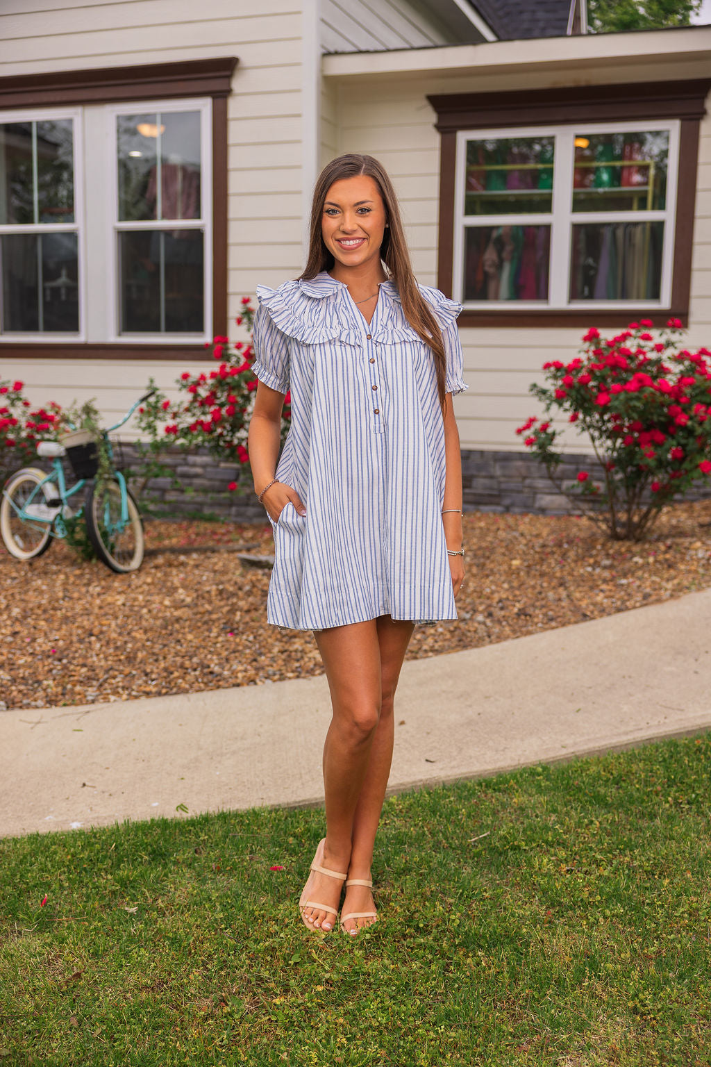 Featuring a delicate ruffled yoke detail and a half button-front design, the Ruffle Charm Dress offers a relaxed babydoll fit and elastic cuff short sleeves. Ideal for any occasion, this dress is not only stylish but also comfortable.