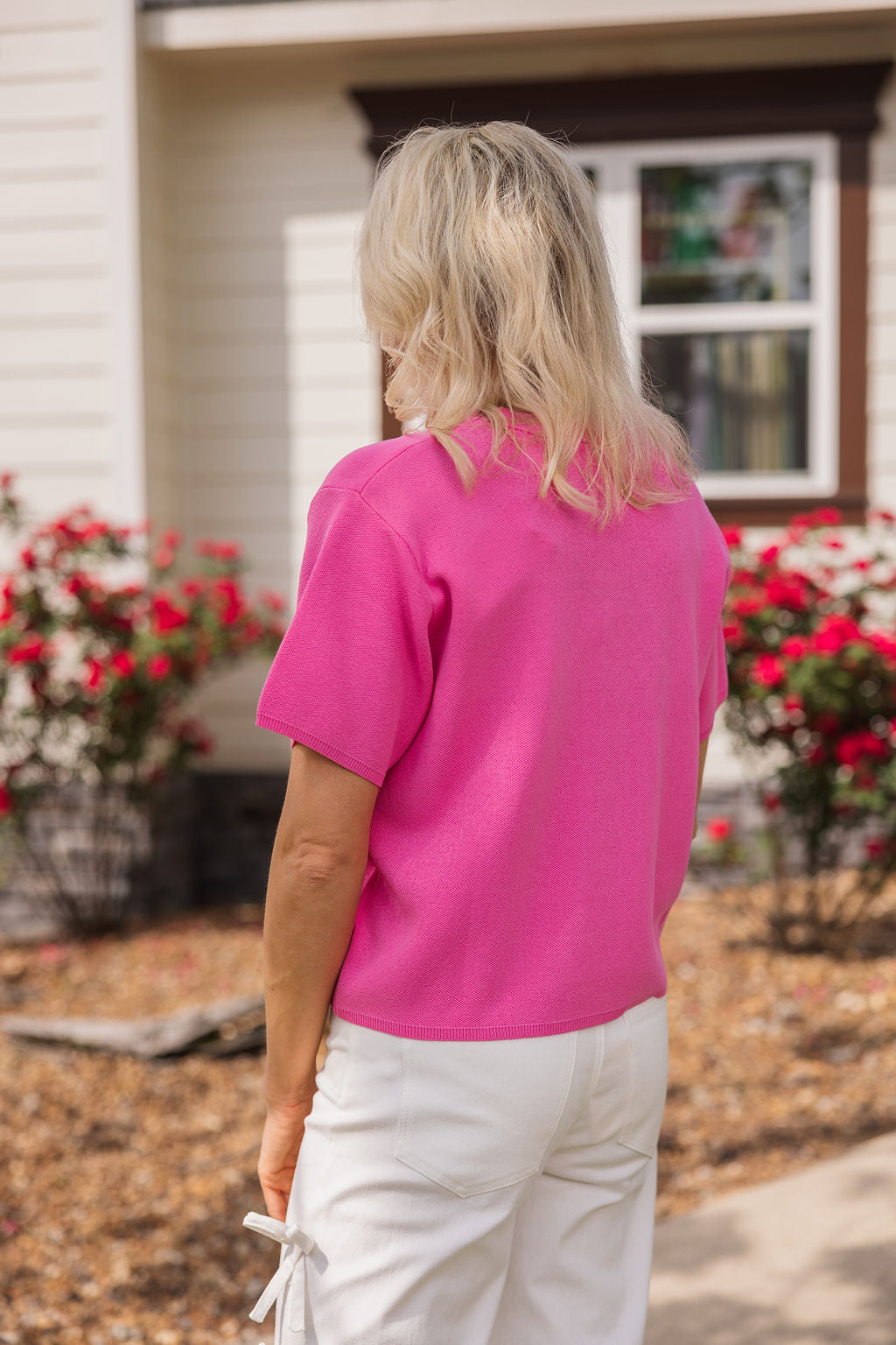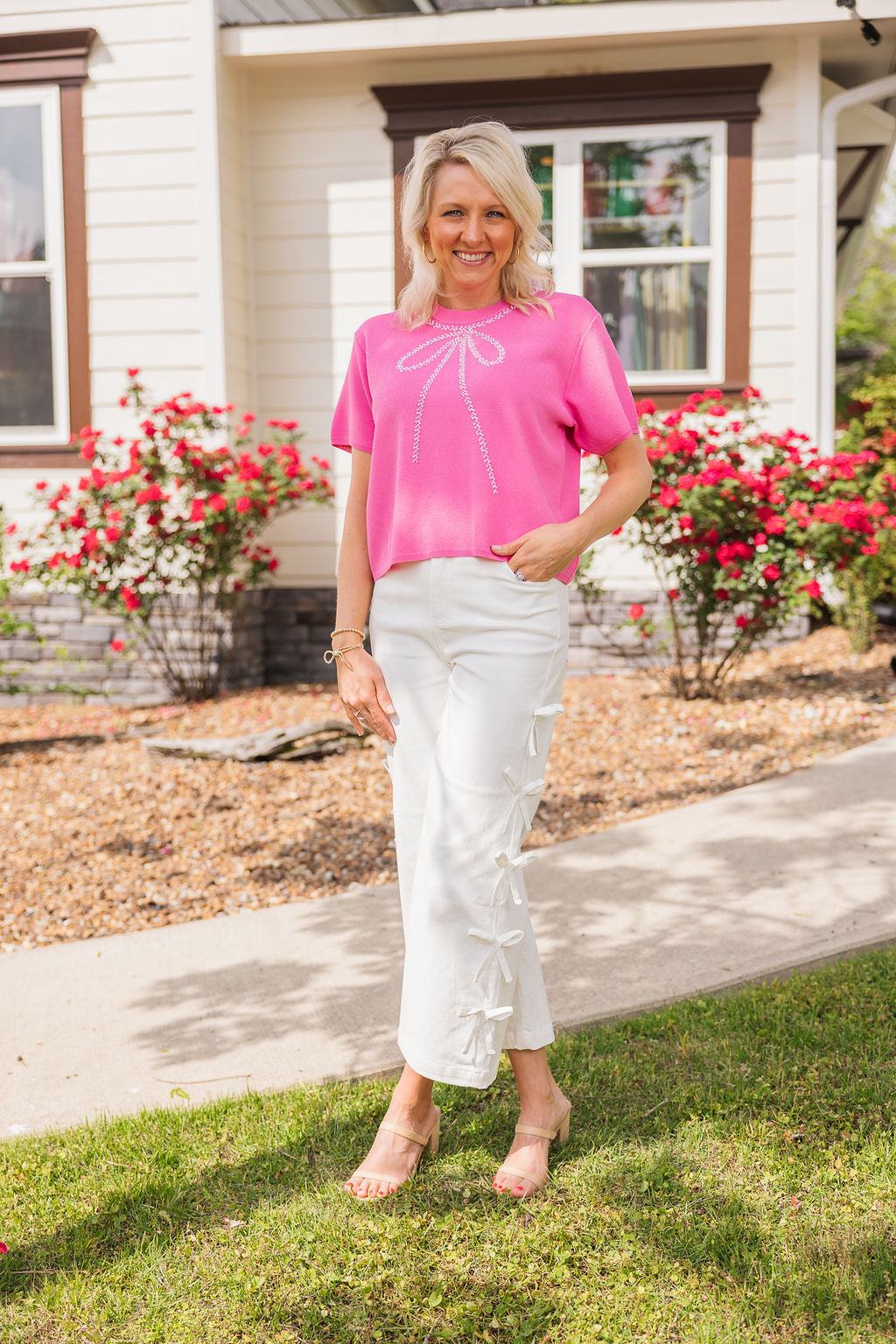 This short sleeve pullover features a charming bow embellishment, adding a touch of sweetness to the classic sweater knit design. With its lightweight and non-sheer construction, it offers both style and comfort. Perfect for any occasion, this pullover is unlined and versatile.
