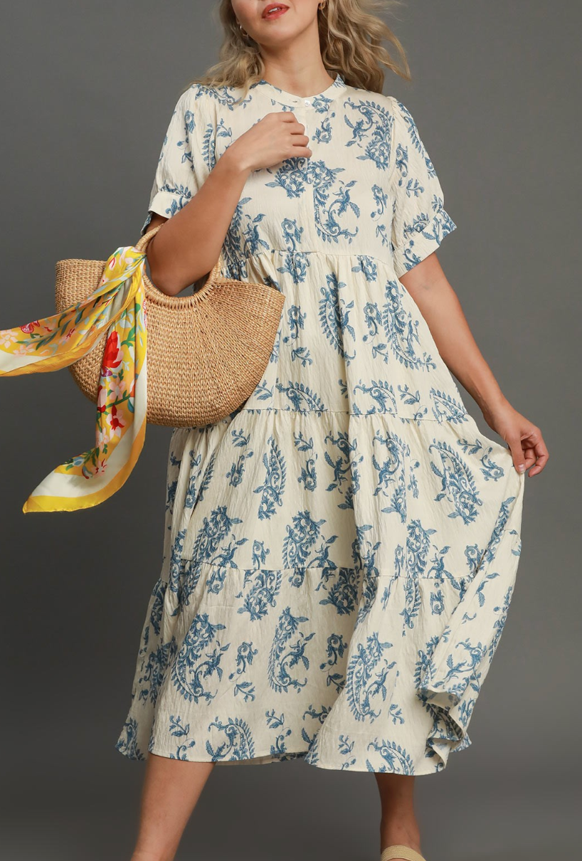 Crafted with crinkled textured fabric, this Tiered Textured Midi Dress boasts a split neckline with a relaxed collar and puff short sleeves for a fashionable edge. Its tiered midi-length skirt and practical side pockets make it a versatile and stylish addition to your wardrobe. Lined for added comfort.