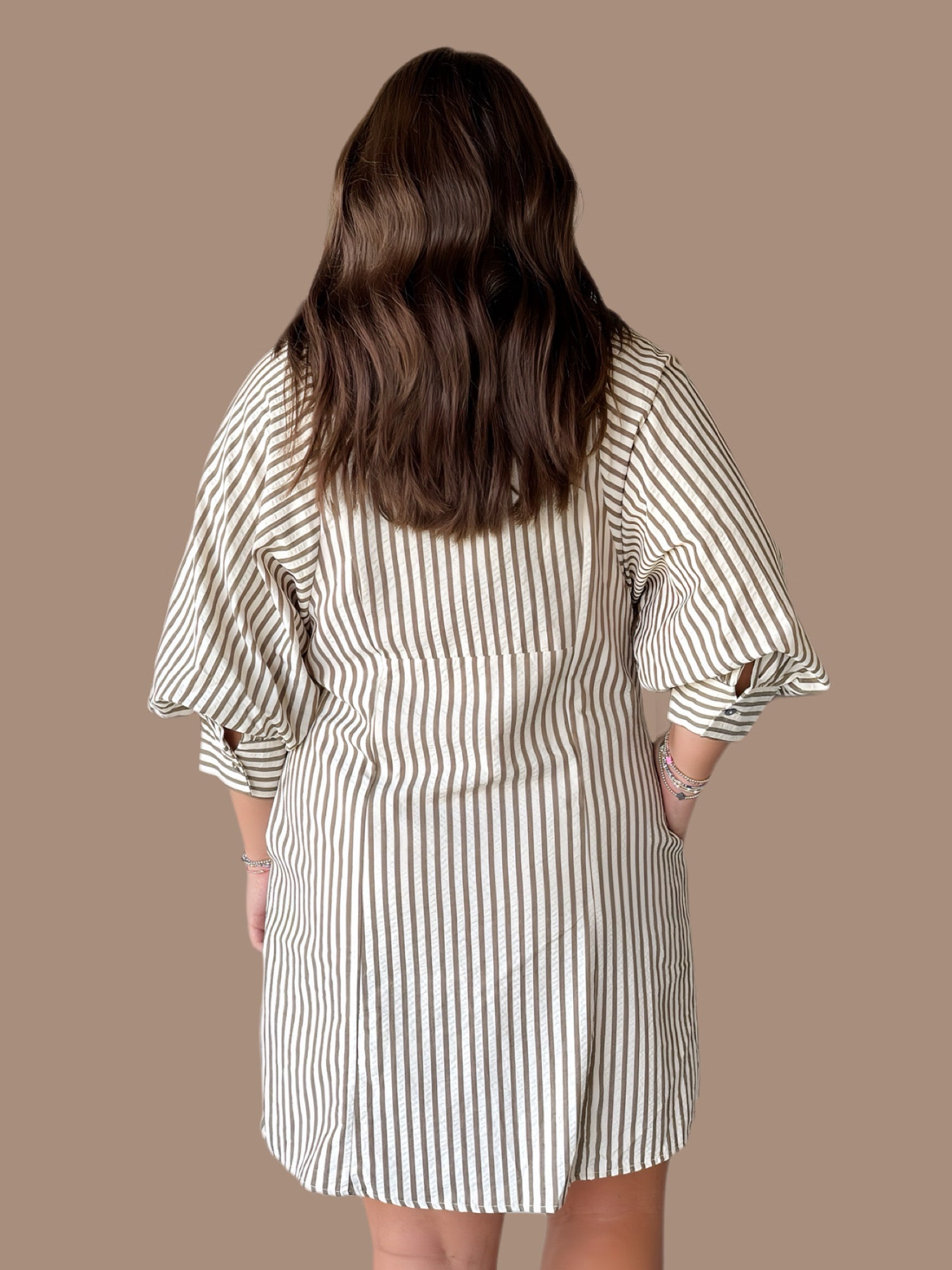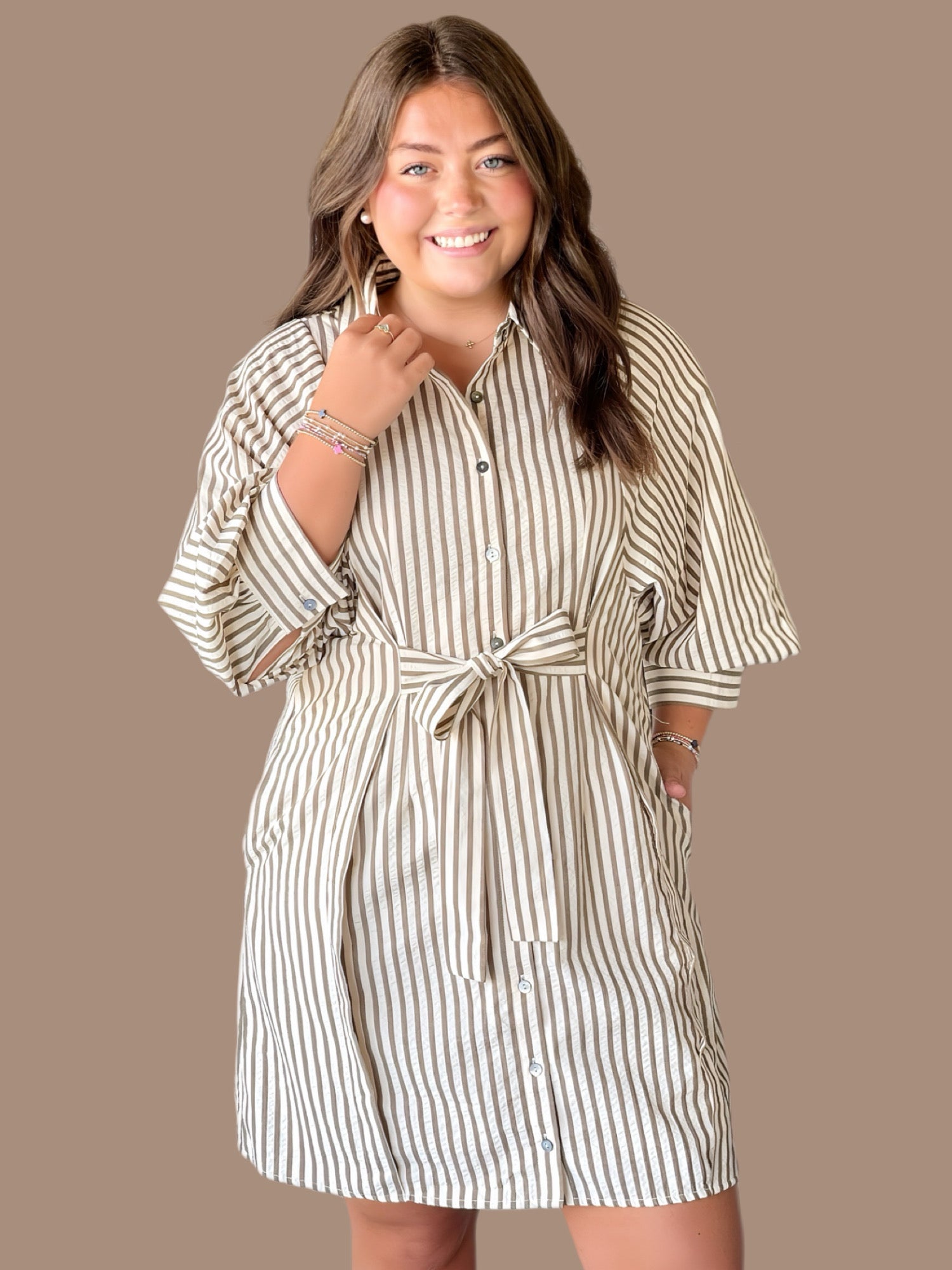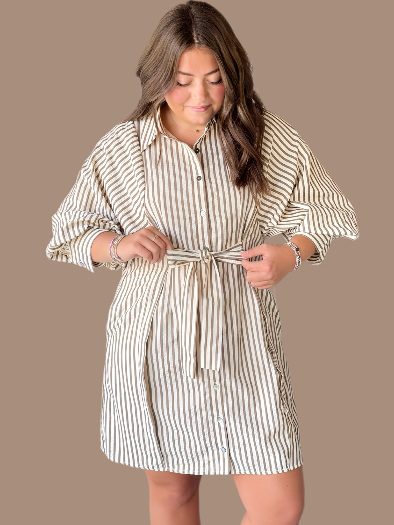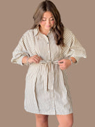 This striped 3/4 sleeve mini shirt dress combines tailored style with practical features. The self-tie belt defines the waist for a flattering silhouette, while the front button closure and buttoned sleeve cuffs add refined details. Lightweight, woven, and fully lined, the dress offers comfort without sheerness. Side pockets provide convenient storage, making it an ideal choice for a polished yet effortless look.