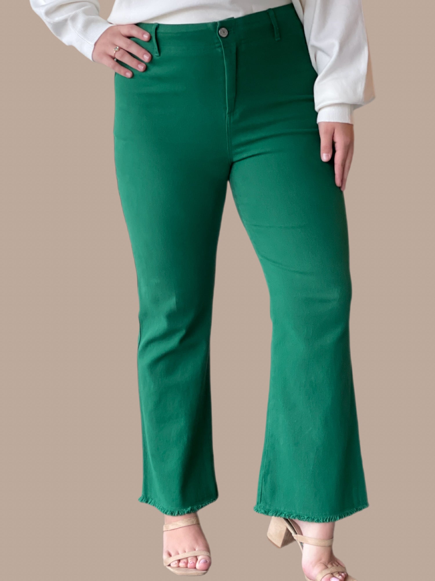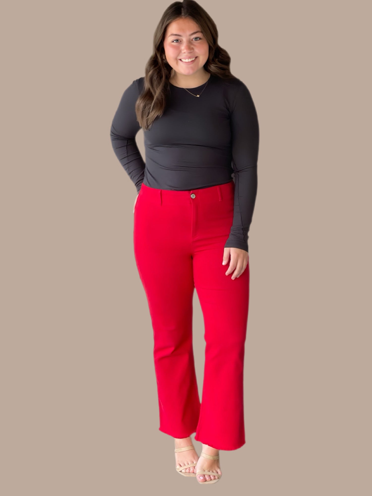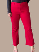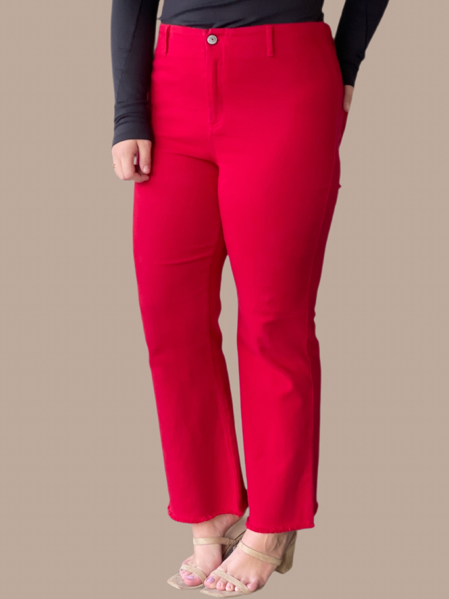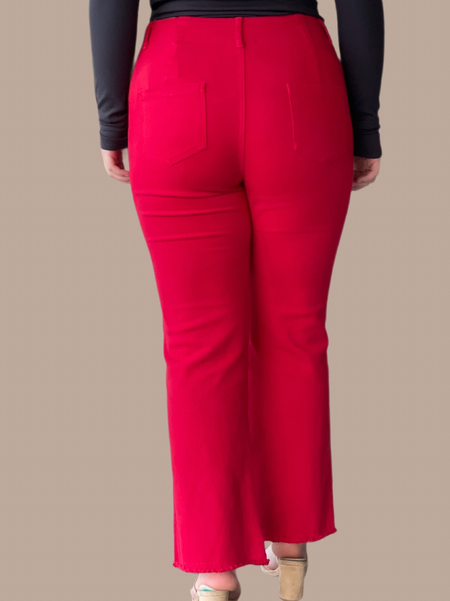 Crafted from premium soft washed fabric with exceptional stretch, these red pants offer all-day comfort without compromising style. The high-rise cut provides flattering coverage while the wide leg silhouette creates an effortlessly chic proportion. A front button closure ensures secure fit, while the distinctive cut edge detail at the hem adds an unexpected design element that sets these pants apart. The adaptable fabric moves with your body, making them ideal for both casual and polished occasions. Pair with any top and footwear to create versatile looks that transition seamlessly from day to evening.