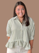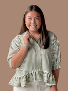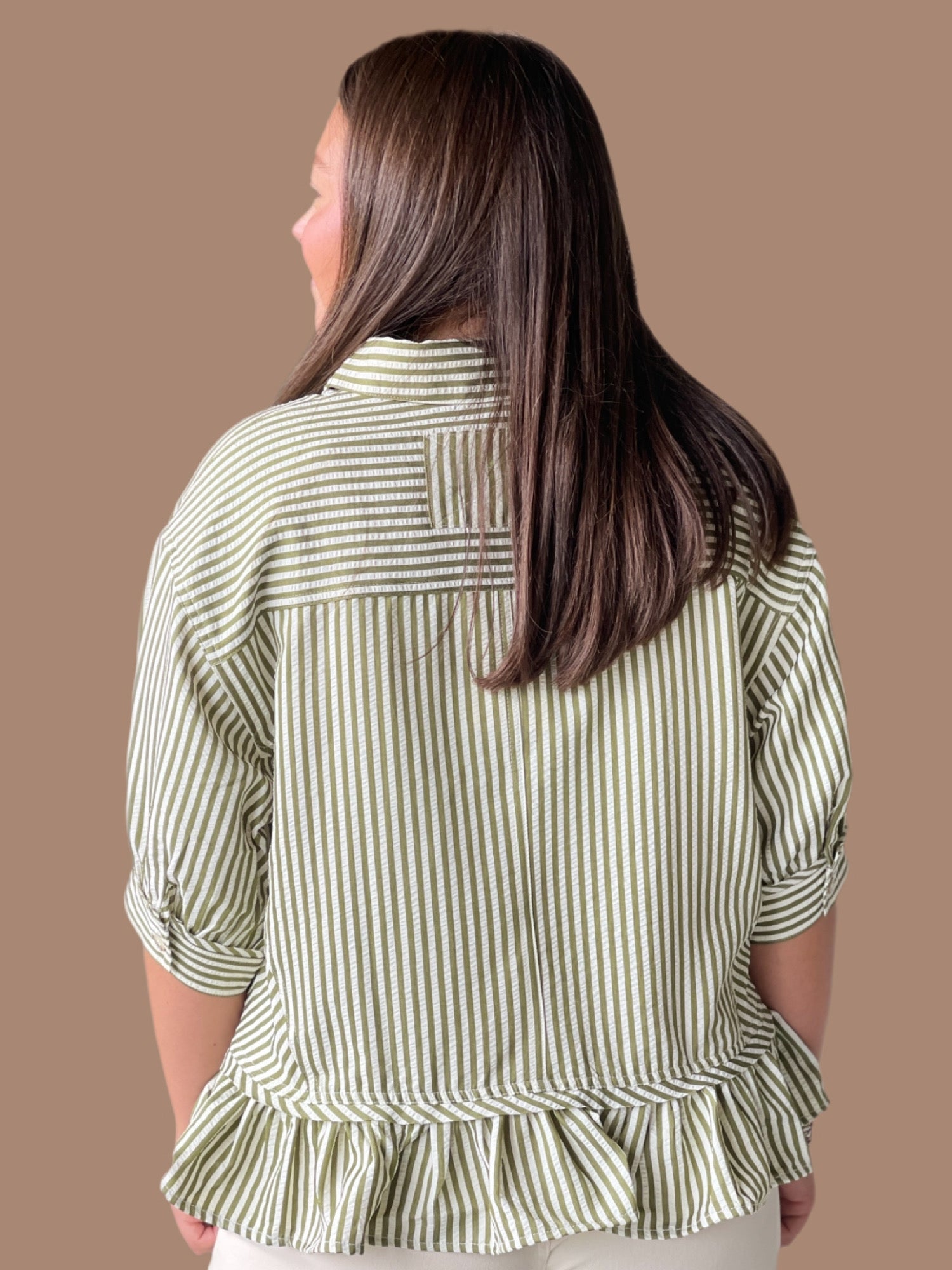 This lightweight woven top features cuffed ¾ sleeves, a ruffle hem, and a classic button front for effortless style.