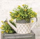 White Diamond Pattern Watering Can is a metal watering can with a distressed white finish and a galvanized metal rim. It has a large curved handle with an embossed diamond pattern for detail and it looks great filled with florals and greenery. Measures 6" high by 14" wide by 5.5" deep.