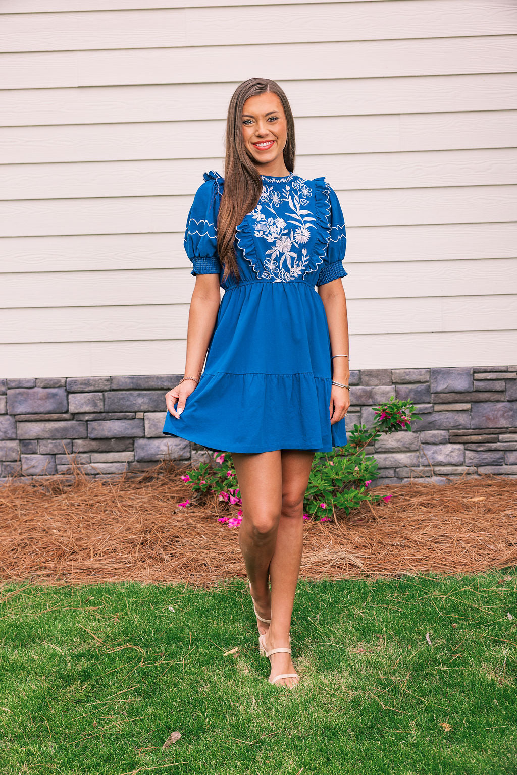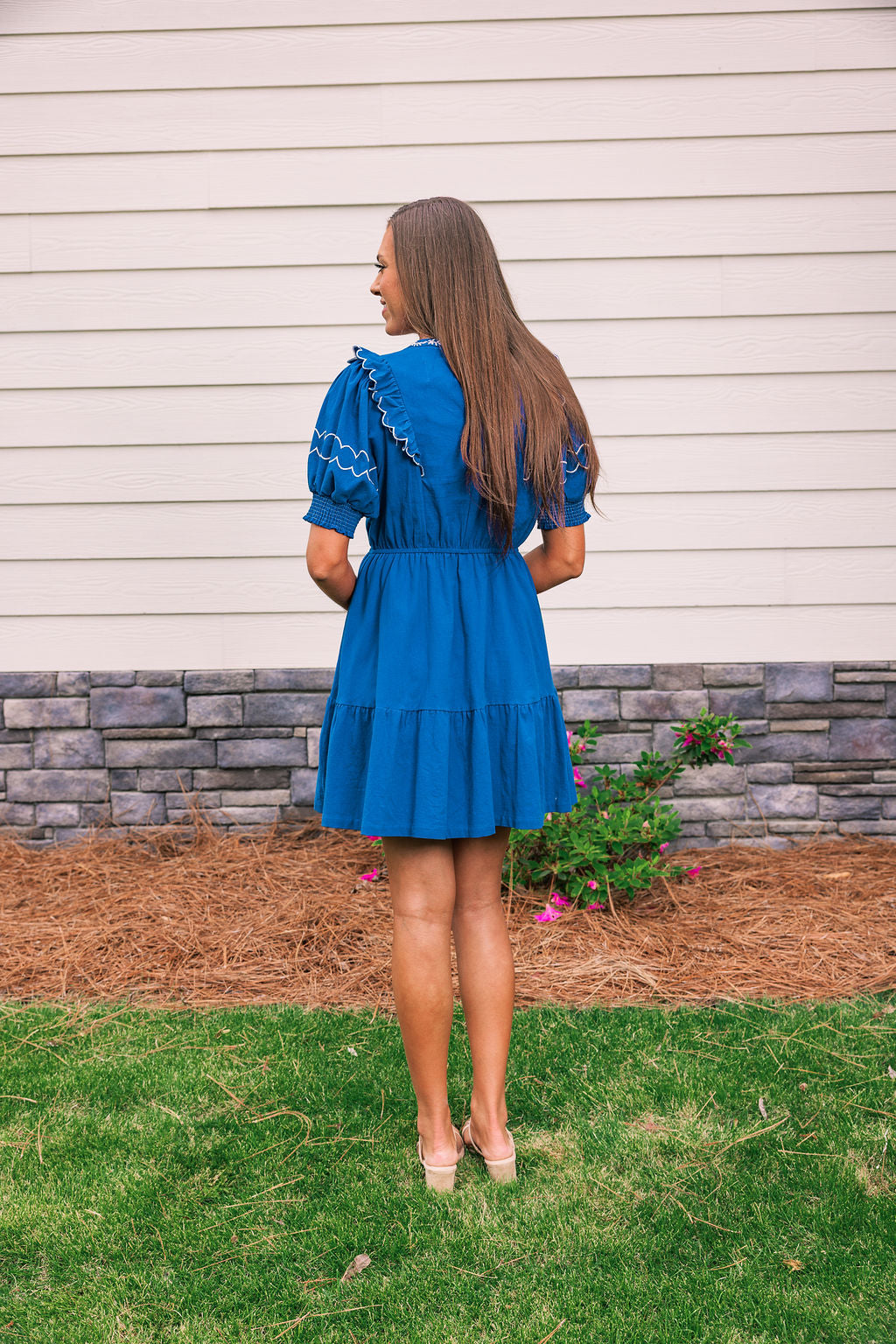 Effortlessly elegant, the Woven Whimsy Mini Dress features an A-line silhouette with delicate embroidery and ruffle detailing. The round neck and back keyhole button add a touch of sophistication, while the off white lining adds a subtle pop. Perfect for any occasion, this dress is a must-have in any fashion-forward wardrobe.